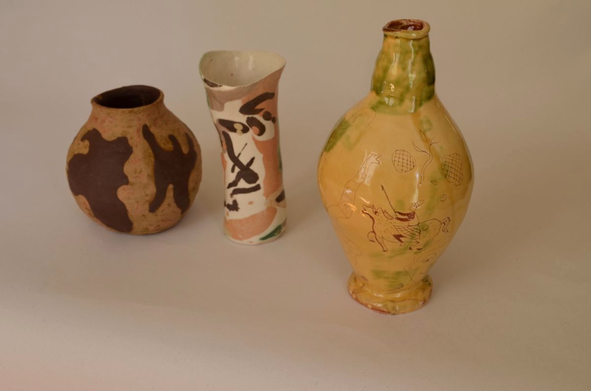 two vases Sampson made with Greek and European clays, oxides and glazes, circa 2016-2018; made in the studios of the “Centre for the Study of Modern Pottery” in Thisseon, Athens. Greece. The 2 vases on the left are part of Sampson’s “Metamorphosis” series, and on the right her take on the Byzantine style.