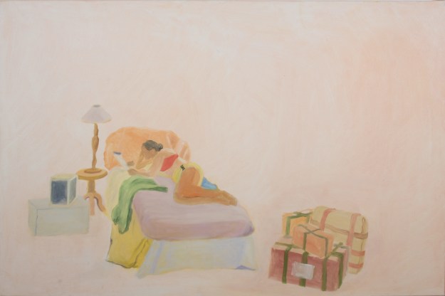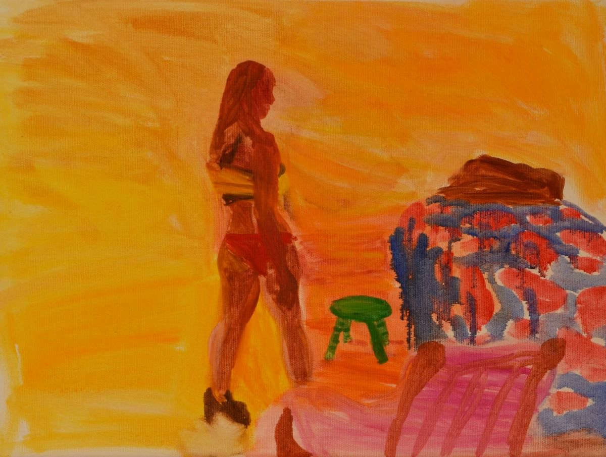 The figure in context is an on-going theme in Stephanie Sampson’s oil paintings. In this period of time where people are living confined lives, these paintings might offer food for thought to viewers about the physical and psychological space they inhabit. Painting one’s experience of an environment or moment, with an economy of means is one of Sampson’s key aims. As an experiential painter, she avoids using photos, and responds to something she is looking at whether a model in her studio or a friend sitting in a garden, the personal intimate world in real time is the motivation. She is fascinated with oil paint as a medium because of the way it can reinvent itself. The versatility and economy oils offers a painter, and the challenges, she explores in her own way by being aware of the physicality of marks and choice of colour.